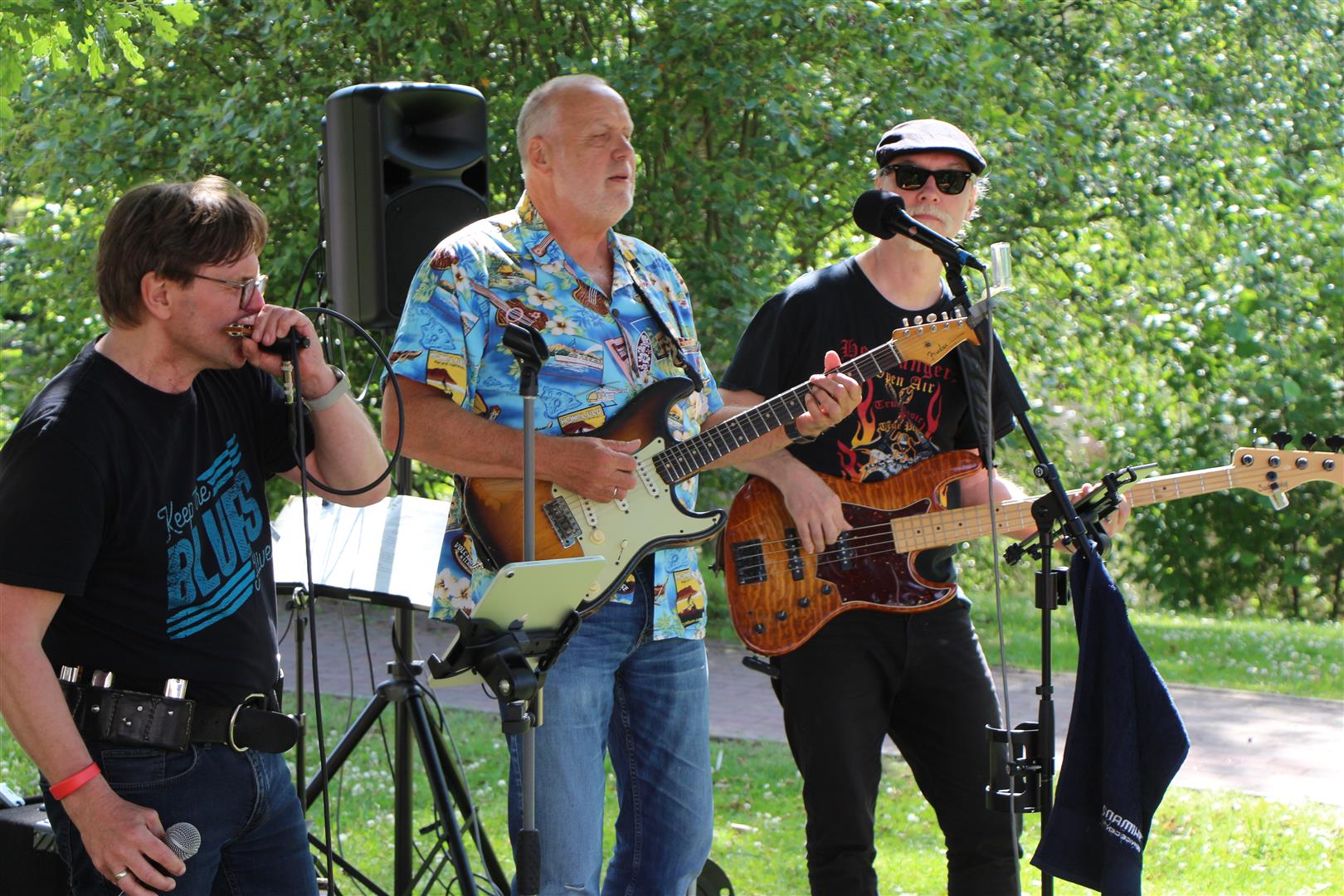 Am Sonntag 29.6.2025 kam nach einigen Regentagen endlich wieder der Sommer nach Elmshorn und ließ zum ersten Mal in dieser Pavillon-Saison echtes open-air-Feeling aufkommen. Sehr passend für das Konzert des Downhome Blues Trios. Unter dem Motto „Blues aus der Seele“ wollten sie zeigen, dass sie den Blues im Blut haben.