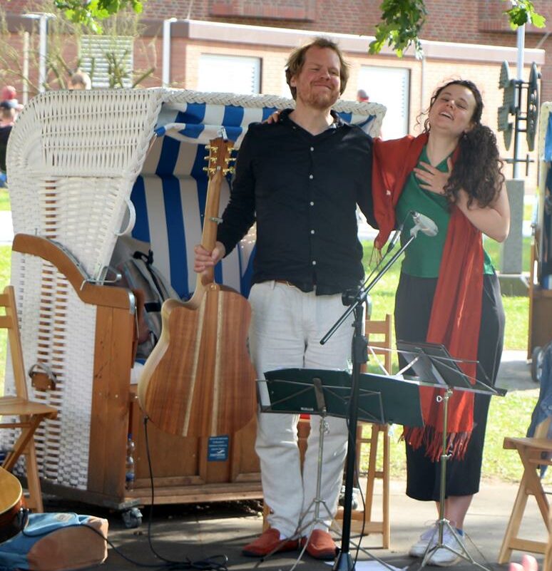 Zu ihrem ersten Konzert am Roten Pavillon hatten sie neben Max‘ Gitarren auch noch Annas Violine und Mandoline mitgebracht. Die Beiden starteten mit „Morrison‘s Jig“ einem traditionell irischen Instrumentalstück, bei dem sie ihre Fingerfertigkeit an Gitarre und Geige unter Beweis stellen konnten.