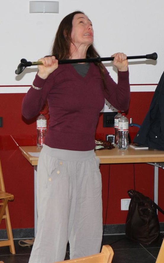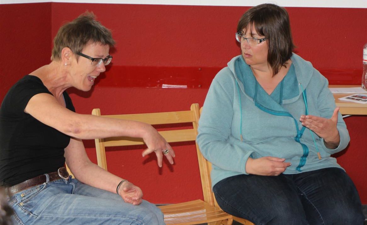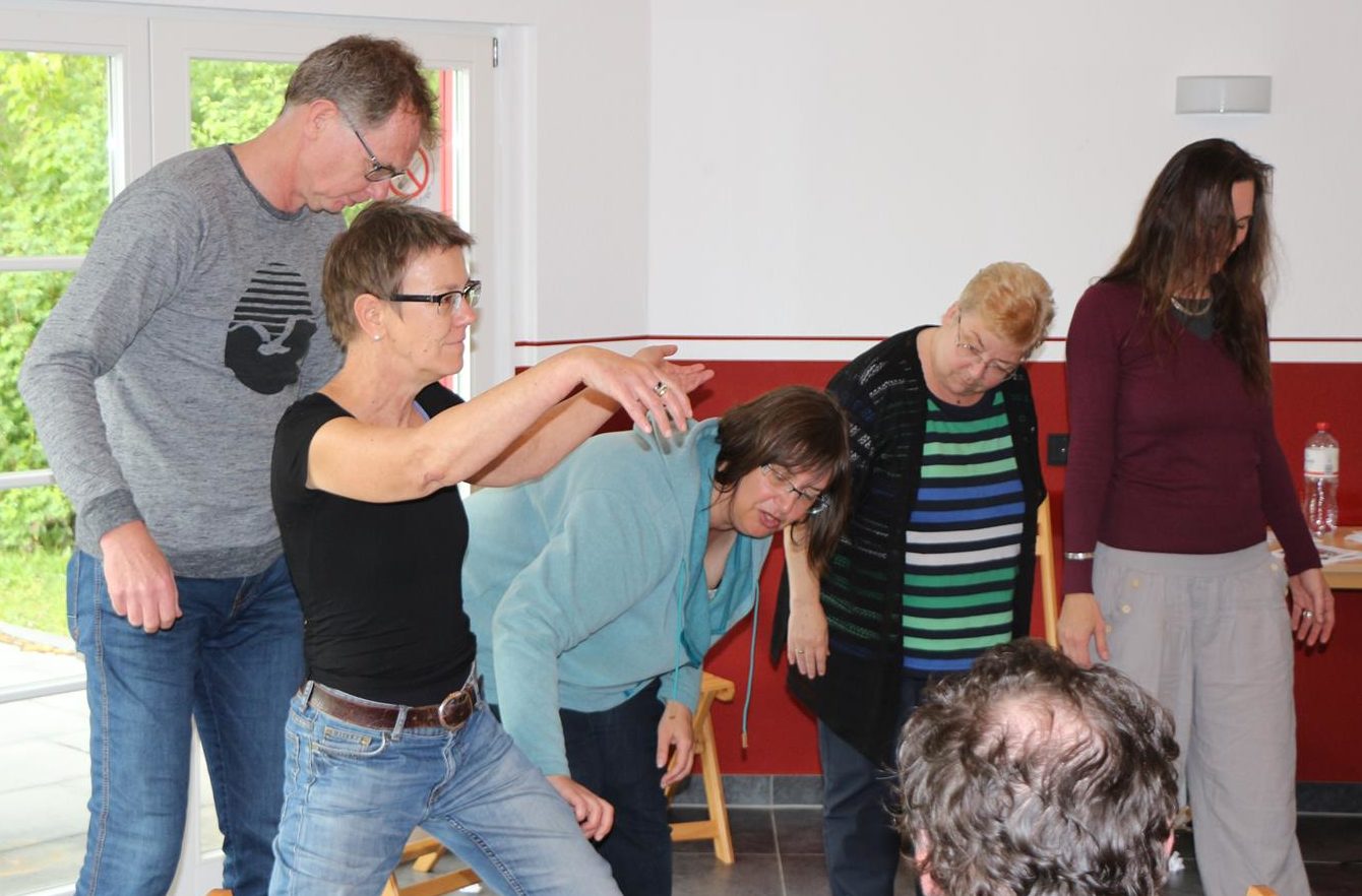 Zum Schluss wurde es besonders witzig, Christa und Antje waren Puppen, die durch zwei freiwillige Zuschauer „bedient“ wurden. Soll heißen, es mussten die Arme und Beine durch Ziehen, leichtes Schubsen bedient und der Kopf durch einen imaginären Knopf im Nacken bewegt werden, um neben dem Sprechen der Situation „Der Schornsteinfeger kommt“ gerecht zu werden. Klar, das gerade das, was schief geht einem beim Lachen buchstäblich die Tränen in die Augen treibt.