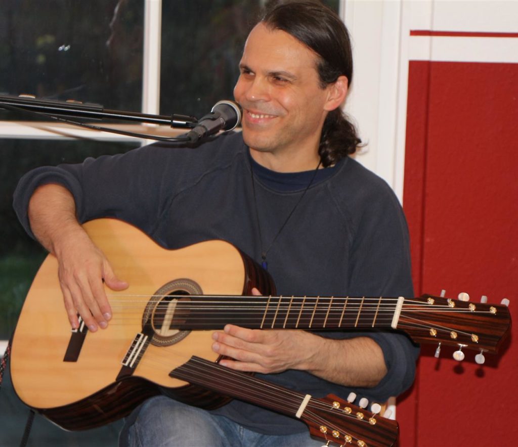 Die Doppelhals-Gitarre ist erst nach der Pause dran. Neben dem klassisch anmutenden Hauptgriffbrett gibt es noch einen zweiten kürzeren und schmaleren Hals, der höher gestimmt ist und klanglich an eine Mandoline erinnert. Beide werden für sich, aber auch gemeinsam gespielt.