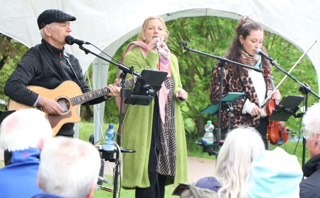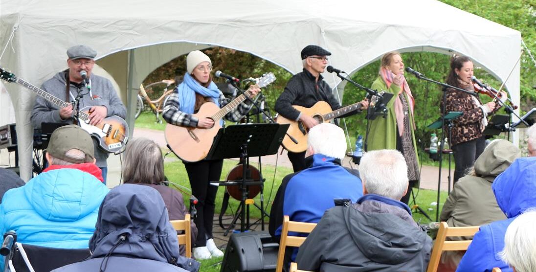 Am Sonntag 4.5.2025 war nach einer frühen Schönwetterphase der erste Tag im Mai mit Apriltemperaturen und Wechsel von Sonne, Wolken und Regen. Nicht der beste Tag für ein openair-Konzert, aber „This is the Life“ so das Motto des Auftrittes der 5 Musiker und Musikerinnen aus Uetersen und Tornesch zum Auftakt unseres Programms 2025.