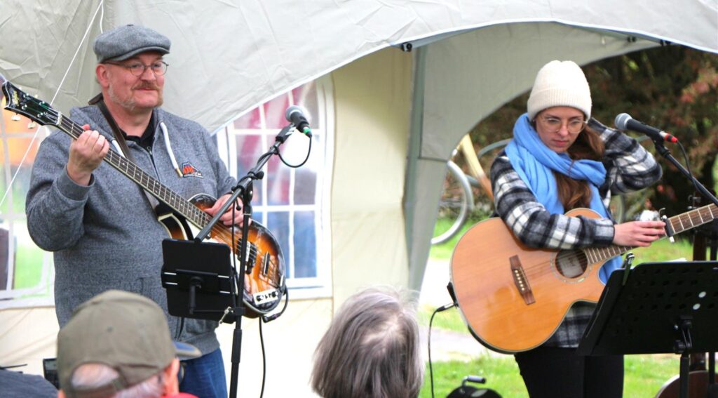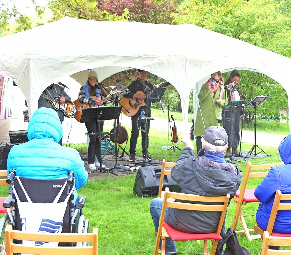 15 Minuten galt es tapfer durchzuhalten, dann hellte es sich wieder auf. Gut, dass norddeutsche Musiker und Pavillon-Publikum sich durch Wind, Wetter und Kälte nicht lange beeindrucken lassen. Gitarren und Geige wurden nachgestimmt, Stimmen nochmal aufpoliert und weiter ging´s.