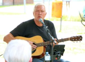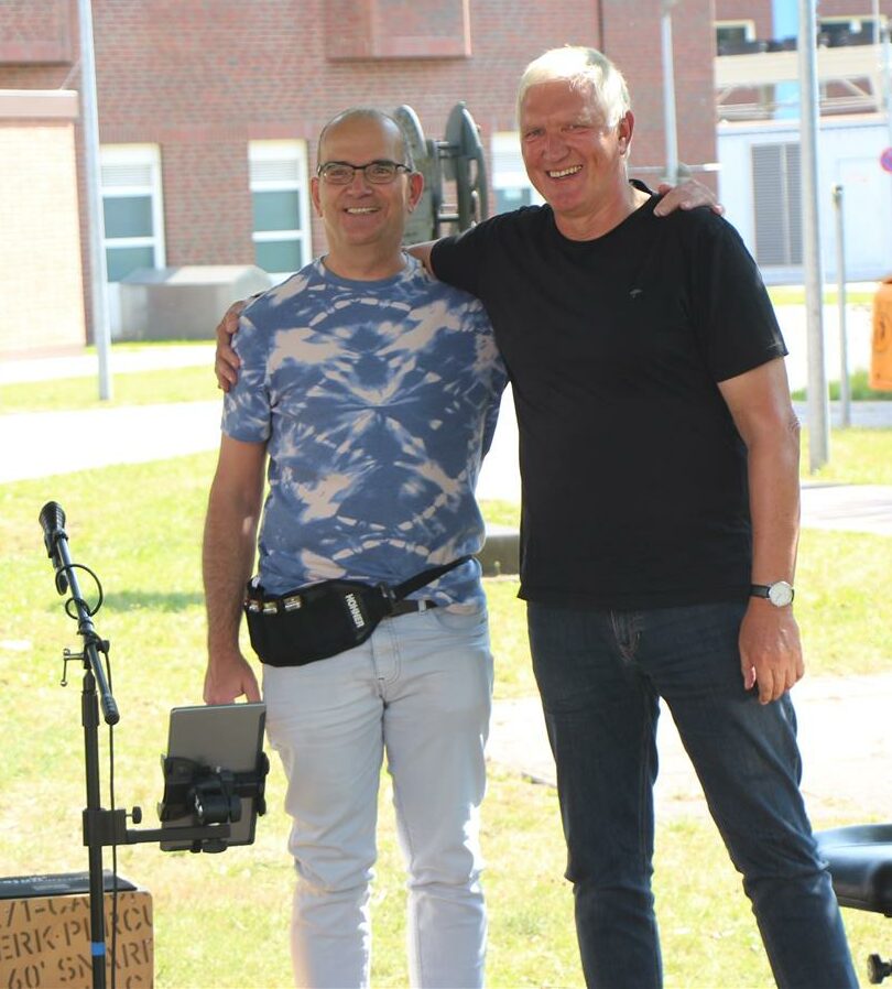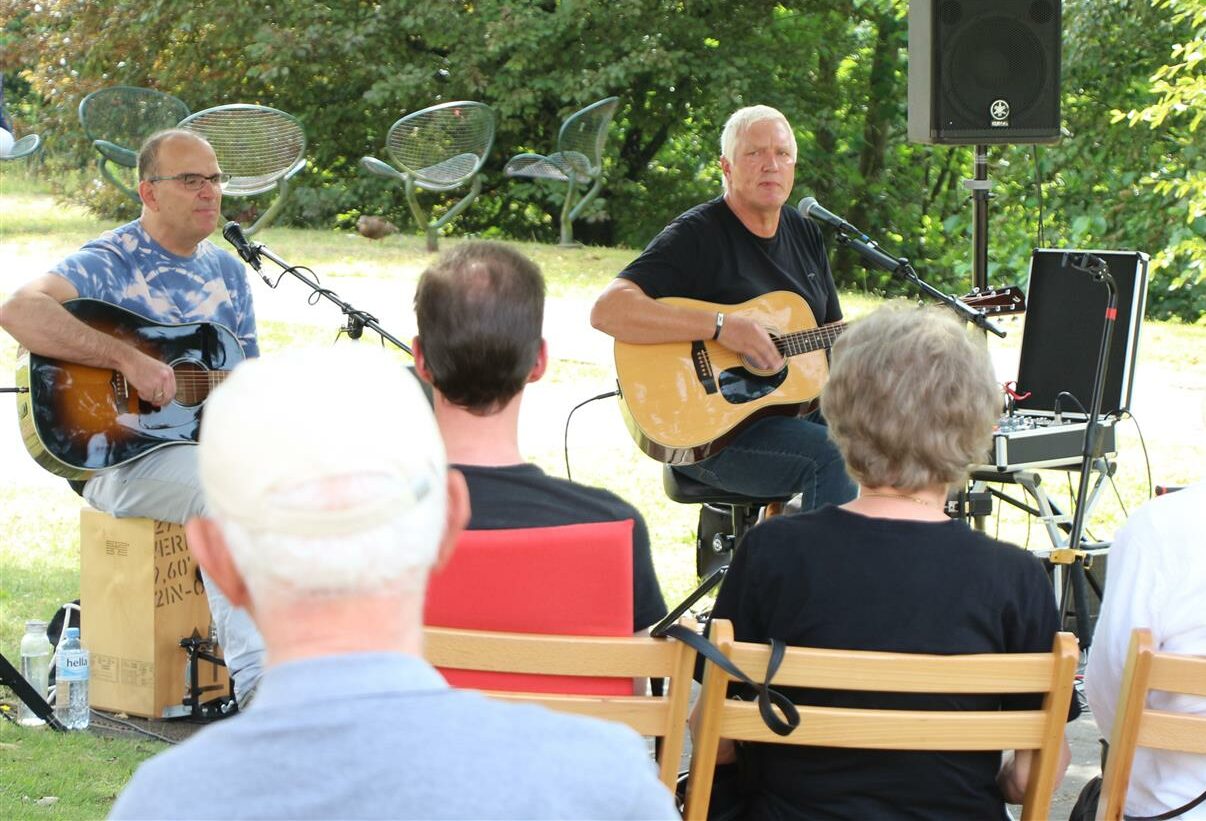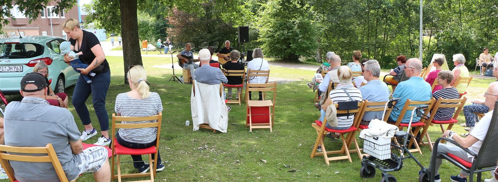 Knapp 40 Besucher auf unserer Außenfläche und eine weitere Handvoll Besucher rings um die Rasenfläche zogen sich nach und nach aus der Sonne in den Baumschatten zurück, um dort mit fröhlichen Gesichtern mitzuwippen und mitzusingen.