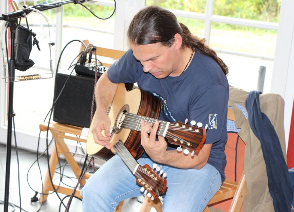Das ist eine doppelhalsige Gitarre, die immer noch unberührt daneben steht. Sie wird erst nach der Pause zum Einsatz kommen. Wie Attila Vural später erklärt, handelt es sich um eine Spezialanfertigung, die er jüngst in der Pfalz entgegennehmen durfte. Er hat sie erst seit 14 Tagen und ist mit ihr im wahrsten Sinne noch auf Jungfernfahrt. Neben dem klassisch anmutenden Hauptgriffbrett gibt es noch einen zweiten kürzeren und schmaleren Hals, der höher gestimmt ist und klanglich an eine Ukulele erinnert. Beide werden für sich, aber auch gemeinsam gespielt. 15 Saiten, die zum Klingen und Swingen gebracht werden. Das Geheimnis der jeweils 7. Saite ist schnell geklärt: Die D-Saite ist einfach gedoppelt. Ach so.